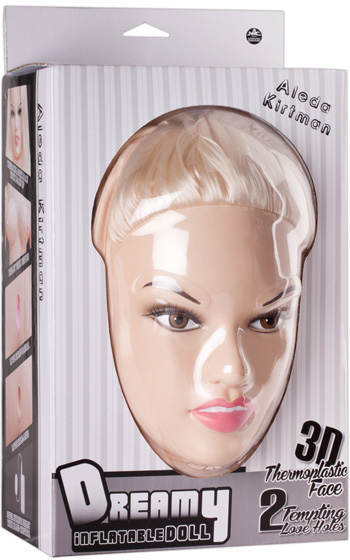 Beskrivning: Uppblåsbar kärleksdocka med realistiskt ansikte tillverkat med en helt ny metod, s.k. 3D Thermoplastic. Aleda har blondt hår uppsatt i toffs, bruna ögon och är elegant sminkad. När lusten faller på kan du välja mellan hennes underbara vagina eller trånga anus. Dockan är av full storlek (150 cm). Ps. Aleda älskar att bli knullad i missionären.