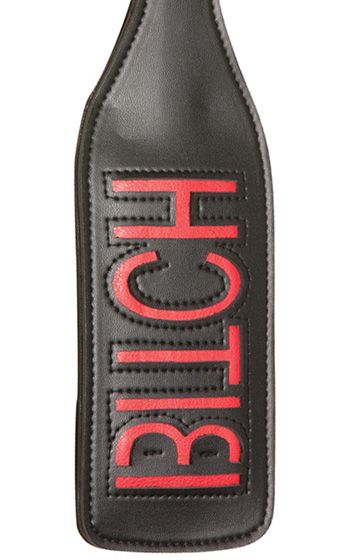 Beskrivning: Svart och röd paddel med texten "BITCH" spegelvänt, lämnar fina avtryck efter lite smisk. Paddeln är sydd hela vägen runt om. Det dubbla lagret lädertimitation är dessutom förstärkt med en metallskena invändigt. Baksidan är helt slät och helsvart.