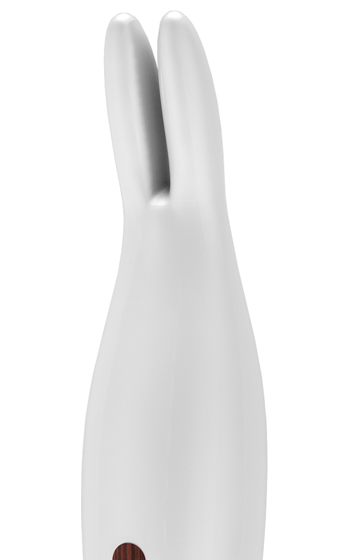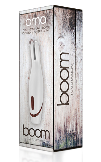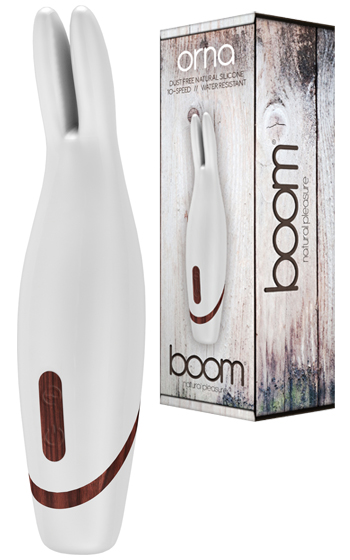 Beskrivning: Orna från Boom är en läckert kaninformad kombination av klitorisvibrator och massagestav. Kaninen är helt silikonbeklädd och har snygga detaljer med träimitation. Vibratorn erbjuder tio kittlande vibrationslägen som får kaninens öron att vibrera ordentligt. Elegant vit färg som i kombination med trädetaljerna är en riktig fest för ögat! Tillverkad av dammfritt silikon som är enkelt att hålla rent. Låg vibrationsvolym på endast 55db. Håll startknappen intryckt 3s för att starta staven och använd den övre knappen för att växla mellan vibrationslägena. Fräck och lite udda stav med stil ur den helt nya serien "BOOM".