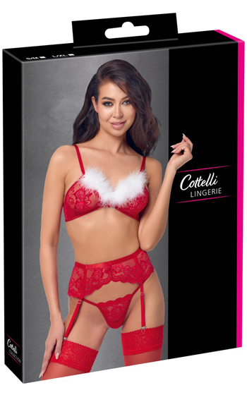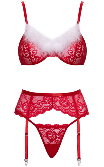 Beskrivning: Ett lekfullt och elegant julset som kombinerar röd spets med festliga detaljer. Setet består av bh, stringtrosa och strumpebandshållare, tillverkade i mjuk och stretchig spets som sitter bekvämt mot huden. De vita fjädrarna på kuporna ger en flirtig kontrast och ett tydligt juligt uttryck.