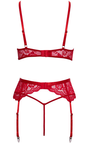 Bh:n är bygellös och har justerbara axelband samt hak-knäppning bak. Strumpebandshållaren har justerbara band och ett ryggspänne som gör den lätt att anpassa. Den matchande spetsstringen fulländar looken och ger en sensuell helhet perfekt för julens mest intima stunder. Observera: Strumpor ingår ej.