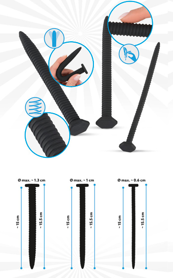 Beskrivning: Trepack skruvade stavar för mannens urinrör. Här är ett prisvärt kit som passar bäst för dig som tidigare penetrerat urinröret och nu vill gå på lite grövre/längre produkter. Ger en otroligt intensiv känsla i urinröret tack vare dess skruvade struktur. Fullt böjbara och gjorda helt i silikon. Längst ned på varje skruv hittar du en platta som stopp för att inte riskera att skruven ska "åka in". Storlekarna på de olika skrivarna är följande: