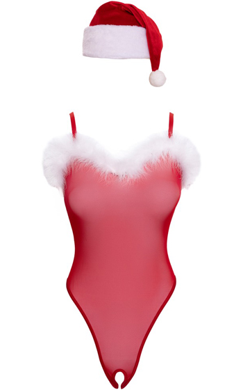 Beskrivning: Ett lekfullt och förföriskt julset som sätter stämningen direkt. Den röda string-bodyn är tillverkad i mjukt, elastiskt powernet som formar sig bekvämt efter kroppen. Den vita fluffkanten längs urringningen ger en festlig kontrast och förstärker den sensuella looken.