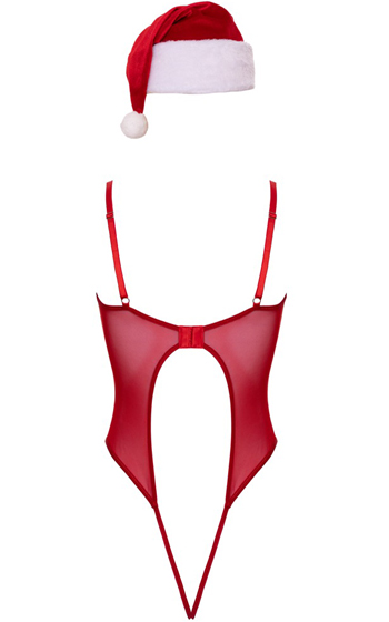 Baktill är bodyn nästan helt öppen, med smala band som ramar in ryggen och lämnar skinkorna fräckt synliga. Justerbara axelband och grenknäppning gör den enkel att anpassa och ta på eller av. Den sammetslena tomteluvan med plyschkant fulländar helheten och gör outfiten både söt och kaxig på samma gång.