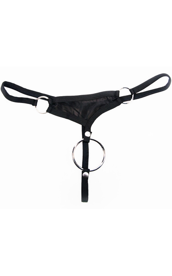 Beskrivning: En string i svart mikrofiber som kombinerar bekväm passform med en utmanande design. De smala, stretchiga remmarna följer kroppen och framtill sitter en avtagbar penisring i metall (Ø 5 cm) som enkelt fästs med tryckknapp.