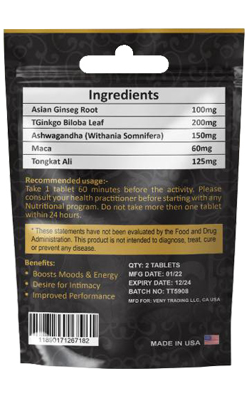 Ingredienser per kapsel (635 mg): Asiatisk Ginseng Rot (Panax) 100 mg, Ginkgo Biloba Blad (Ginkgo biloba) 200 mg, Indisk Ginseng (Panax) 150 mg, Maca rotfrukt (Lepidium meyenii) 60 mg, Tongkat ali ört (Eurycoma longifolia) 125 mg.
