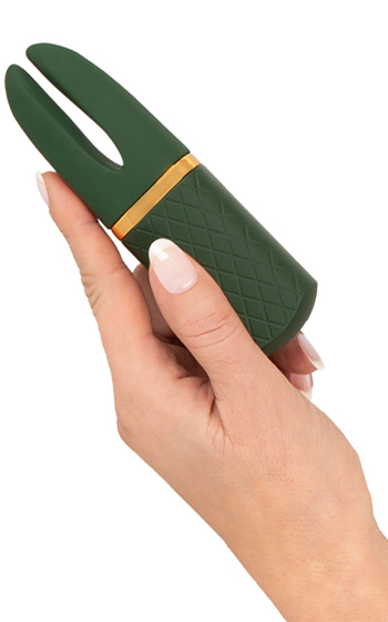 Smidig storlek som passar i vilken handväska som helst. Halkfri i materialet med struktur vid själva handtaget för än bättre grepp. Produkten fungerar självklart även bra för stimulans av bröstvårtor, testiklar och perineum. De flexibla armarna är 5 cm långa. Helt vattentät och kan användas både i och under vatten. Uppladdningsbar via medföljande USB-kabel.