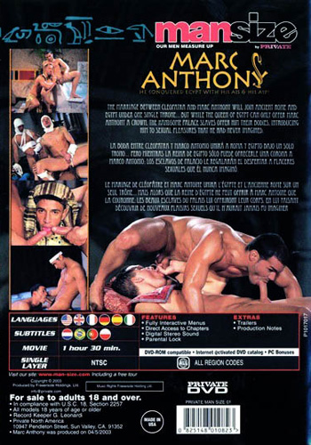 Beskrivning: Welcome to the world of Ancient Rome and Egypt. Its 58BC and the beautiful Egyptian Queen Cleopatra is in turmoil. The Egyptian empire is falling apart at the seams and she doesnt know how to save her beloved kingdom. She asks the Gods and they tell her she must marry and bear a child to handsome Roman General Marc Anthony. She sends for him and they are married, but then the real problems start, because Marc Anthony is GAY! As Marc Anthony fucks his way around the Egyptian palace, Cleopatra begins to suspect that Marc may not be able to provide her with an heir to the throne. She tries everything to turn him straight including magic potions and spells, but when youre gay youre gay! Awards won by the movie "Marc Anthony": -Venus 2003 Special Jury Award-Marc Anthony -FICEB 2003 Heat Gay for Best Supporting Actor, Lucas Foz, for Marc Anthony, US gay magazine X Factors annual The Hard Choice Awards 2003 Best Blowjob of 2003 (Mario Perez + Black Jack).