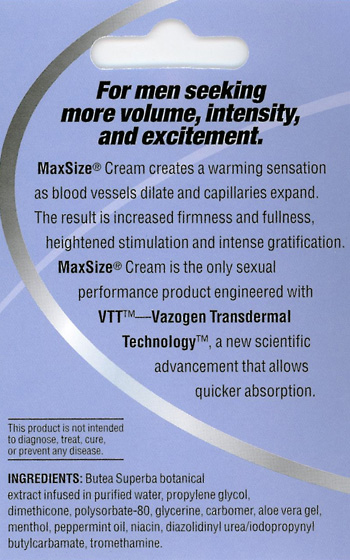 Beskrivning: Max Size Cream är en av de mest populära krämerna bland våra prestationshöjande produkter för honom. Denna produkt finns sedan tidigare i storlekarna 10 ml samt 148 ml och kommer här i portionsförpackning. Max Size förbättrar den manliga erektionen och storleken snabbt och effekt. Applicera krämen direkt på ollonet för snabb absortion och omedelbara resultat.