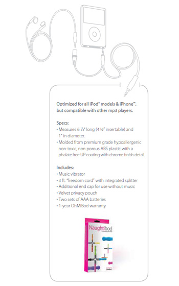 Beskrivning: Denna vackra Vibe har bra tryck och kommer att rocka din värld! Du kommer inte att vilja lägga ner det! Kompatibel med alla telefoner / surfplattor och mp3-spelare som har en vanlig ljudutgång för hörlurar. Naughtibod massager är perfekt storlek för väskan eller att ta med när du reser. Har du inte möjlighet att koppla den till en Ipod så har den 7 vibrationsmöjligheter som du ställer in manuellt.