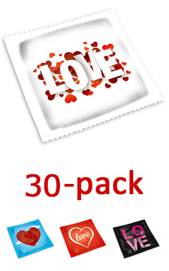 Beskrivning: 30-pack av Pasantes otroligt populära kondom Love. Kondomen finns sedan tidigare att köpa i enpack samt 144-pack. I detta paket får du blandat med de fyra olika folierna du ser på bilden. Lättar garanterat upp stämningen oavsett om du har en tillfällig träff eller om du överraskar din käresta på självaste alla hjärtans dag med lite nya kondomer. Samtidigt är den en perfekt och diskret gåva till en kompis du vill vara extra kärleksfull mot. Glidmedelsbehandlad i standardstorlek, precis som Pasantes övriga sortiment självklart testad och godkänd. Kondomerna levereras i en neutral förpackning.
