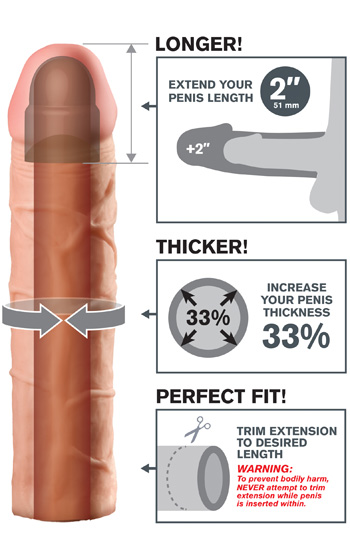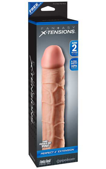 Beskrivning: Perfect 2 tum är en penisförlängande och förtjockande produkt som dras över din penis och sitter fast likt en kondom. Den är mycket lik en äkta penis, såpass lik att en tillfällig partner förmodligen inte skulle känna skillnad mot din riktiga. För absolut bästa passform är det bra om din penis är maximalt 14 cm lång och minst 3 cm bred. Produkten kan användas även av dig som är större men kommer då inte täcka hela vägen ner till roten. Töjbart material som ligger slimmat mot din stake för att sitta kvar under penetration. Verklighetstrogen i såväl känsla som utseende. Får endast användas tillsammans med vattenbaserat glidmedel och bör pudras med Renewing Powder efter tvätt och tork.
