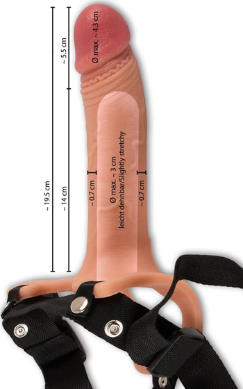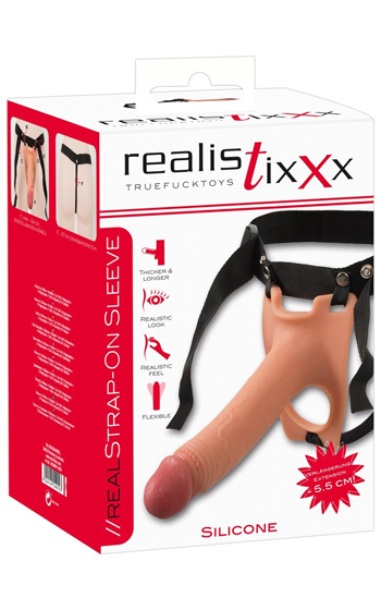 Beskrivning: Strap-on Sleeve från Realistixxx som är framtagen för dig som vill ha lite extra storlek, fyllighet och ett stabilare grepp i en och samma produkt. Konstruktionen kombinerar en realistisk penissleeve med sele för att hålla allt säkert på plats även vid rörelser.
