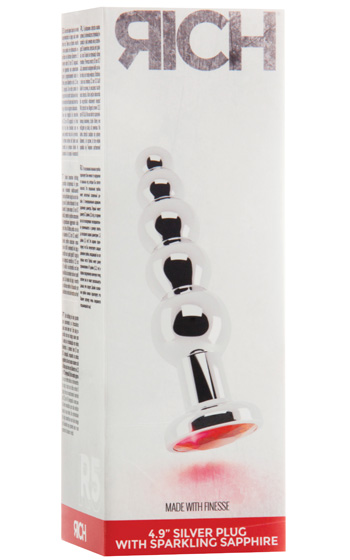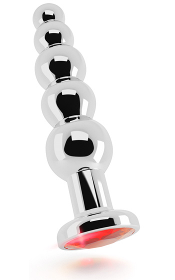 Beskrivning: Mycket snygg analplugg i blank silver som med sina fem steg till viss del också fungerar som analkulor. Dess tjockaste diameter på 3 cm gör den till en mittemellanplugg som inte är alldeles för tjock. Röd sten i botten vilket gör att den samtidigt kan fungera bra som present till någon du tycker om som inte är rädd för lekar i rumpan. Då pluggen är tillverkad helt i metall kan du värma den under varmt vatten eller kyla ned den i kylen för en extra spännande upplevelse. När orgasmen närmar sig drar du ut den steg för steg för att uppleva en explosion du tidigare bara drömt om.
