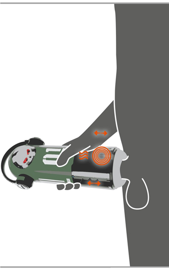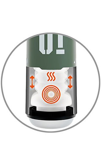 Invändigt arbetar tre funktioner som kan användas var för sig eller tillsammans. Vibrationer, tryckande stötmassage och värme samspelar för att skapa ett jämnt och omslutande tryck runt hela penis. Värmen når kroppsnära temperatur och bidrar till en mer realistisk och behaglig känsla under användning.