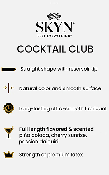 Beskrivning: Skyn Cocktail Club är en lekfull och genomtänkt, smaksatt kondom för dig som vill kombinera tryggt skydd med smak, doft och en extra sensuell känsla. Tre olika smaker inspirerade av klassiska cocktails - Piña Colada, Cherry Sunrise och Passion Daiquiri - perfekta för oralsex eller när du vill göra stunden lite mer inbjudande och mindre klinisk.