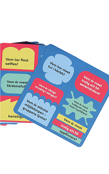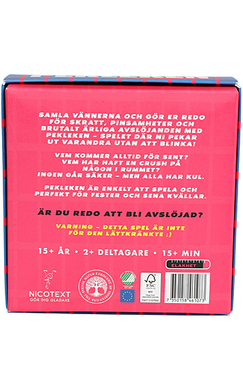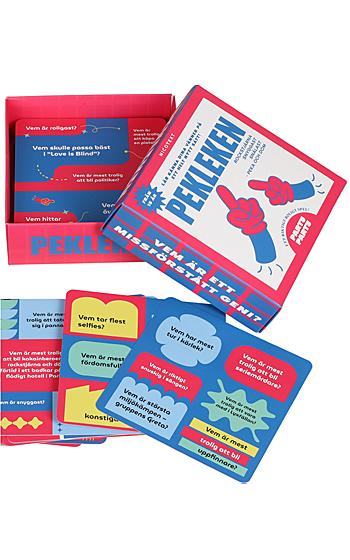 Beskrivning: Pekleken är spelet som snabbt höjer pulsen i rummet och får både skratt och nervösa blickar att flyga runt. Här finns inga filter och inga säkra zoner – bara raka frågor där någon alltid blir utpekad. Ibland på skoj, ibland lite för träffsäkert.