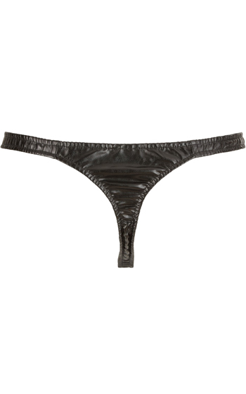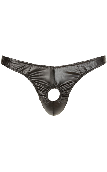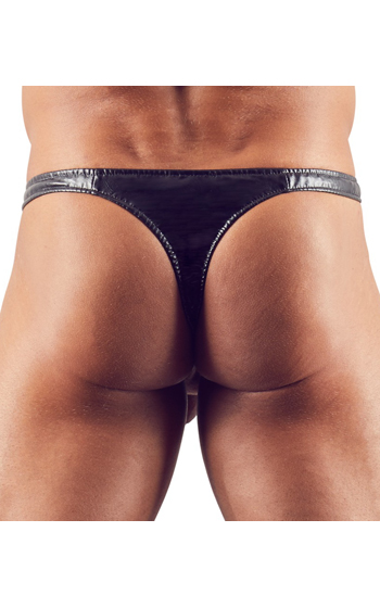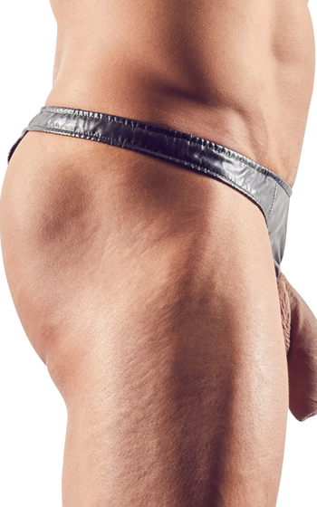 Beskrivning: En utmanande stringkalsong i glänsande konstläder som garanterat drar blickarna till sig. Framtill finns ett flexibelt hål där penis och testiklar placeras, vilket både framhäver och ger en markerad push-up-effekt.
