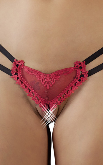 Beskrivning: Enkel röd stringtrosa som ser ut som ett hjärta, med svart rosett baktill. Två elastiska band på varje sida. Tyget på hjärtat är lätt transparent av spets, och ger ett både sexigt och utmanande utseende. Överraska din partner inför en betydelsefull årsdag, eller varför inte på alla hjärtans dag? Tillverkad av 100% bomull.