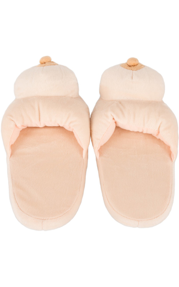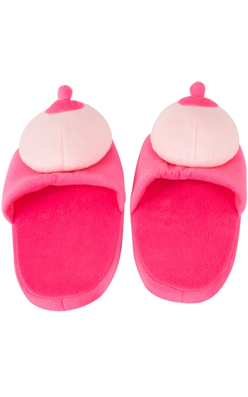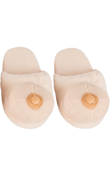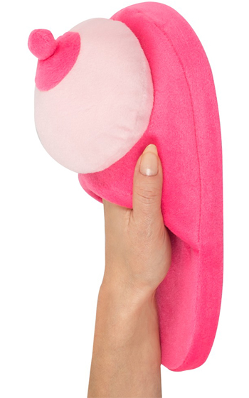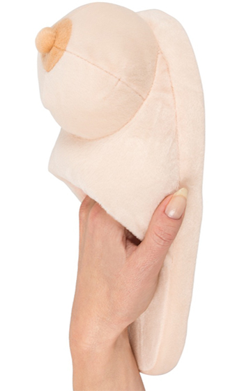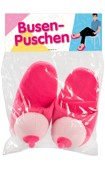Beskrivning: Tofflor som är gjorda för dig som uppskattar humor med tydlig attityd. Mjuka, bekväma och omöjliga att missa, med ett par välformade bröst som kronan på verket. Perfekta som present, svensex-skoja eller bara som ett sätt att visa att du inte tar livet på för stort allvar.