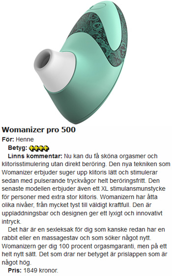 Beskrivning: Nyheten Womanizer Pro W500 Mint är en läckert mintgrön produkt och andra generationen av världskända Womanizer. Denna produkt har modellbeteckningen Pro W500 och är bättre än sin föregångare på många sätt. Pro W500 är både något mindre, tystare, lättare och framförallt är den ännu mer tillfredsställande! Precis som första generationen suger och stimulerar den via impulser. Impulserna väljer du själv mellan 8 olika intensitetsnivåer som justeras via plus och minus på produkten. Toppen som anlägger mot klitoris är löstagbar och kommer i två olika storlekar tillsammans med produkten.